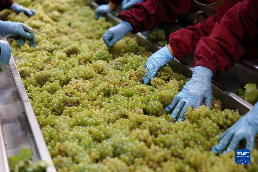 工作人員在銀川市西夏區志輝源石酒莊分揀釀酒葡萄(9月1日攝)。