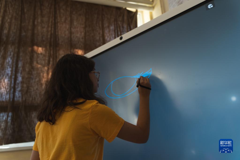 9月1日,在塞爾維亞北部伏伊伏丁那省的一所小學(xué),一名學(xué)生使用華為智慧屏繪畫(huà)。