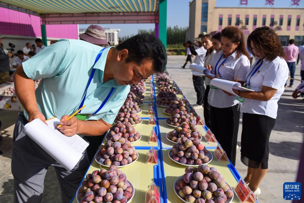 在新疆伽師縣粵伽新梅產(chǎn)業(yè)園舉行的伽師新梅展銷(xiāo)會(huì )評選大賽現場(chǎng),評委為參賽新梅打分(8月4日攝)。
