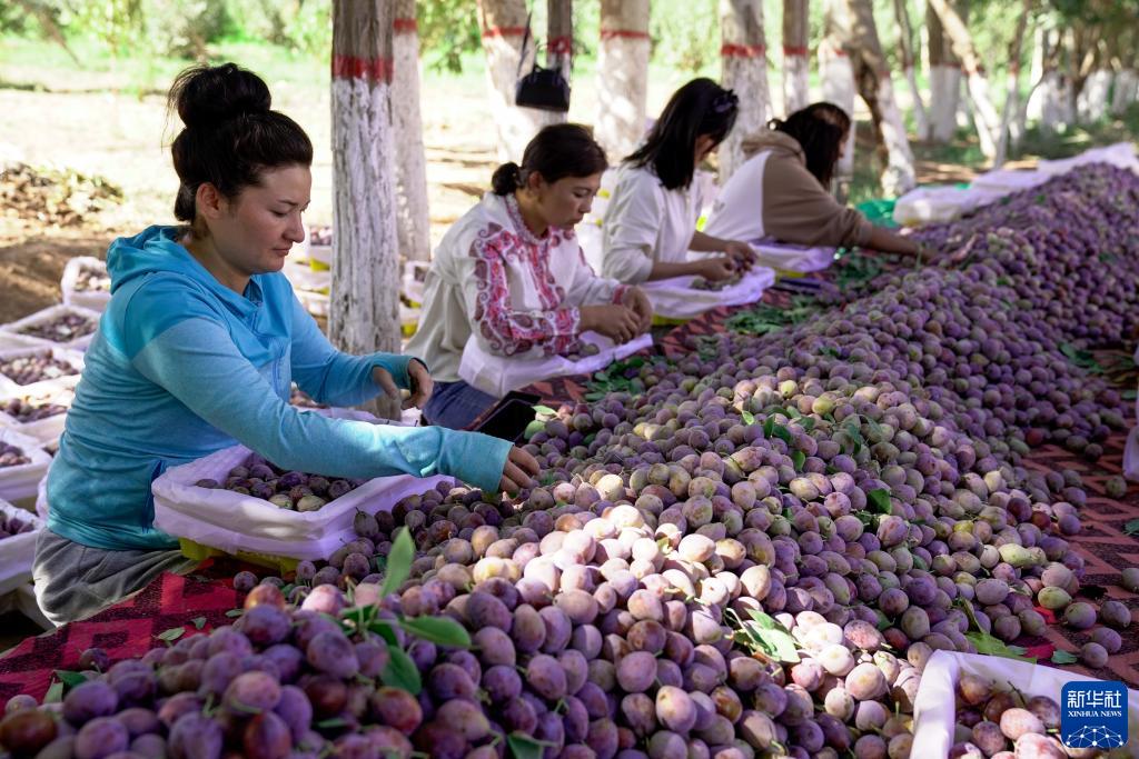 在新疆伽師縣英買(mǎi)里鎮拉依力克村,果農在分揀包裝采摘的新梅(8月30日攝)。