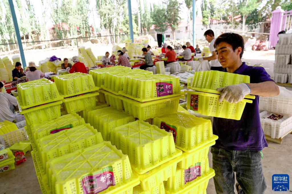 在新疆伽師縣英買(mǎi)里鎮拉依力克村的一家新梅合作社,果農將采摘分揀好的新梅搬運至冷庫(9月2日攝)。