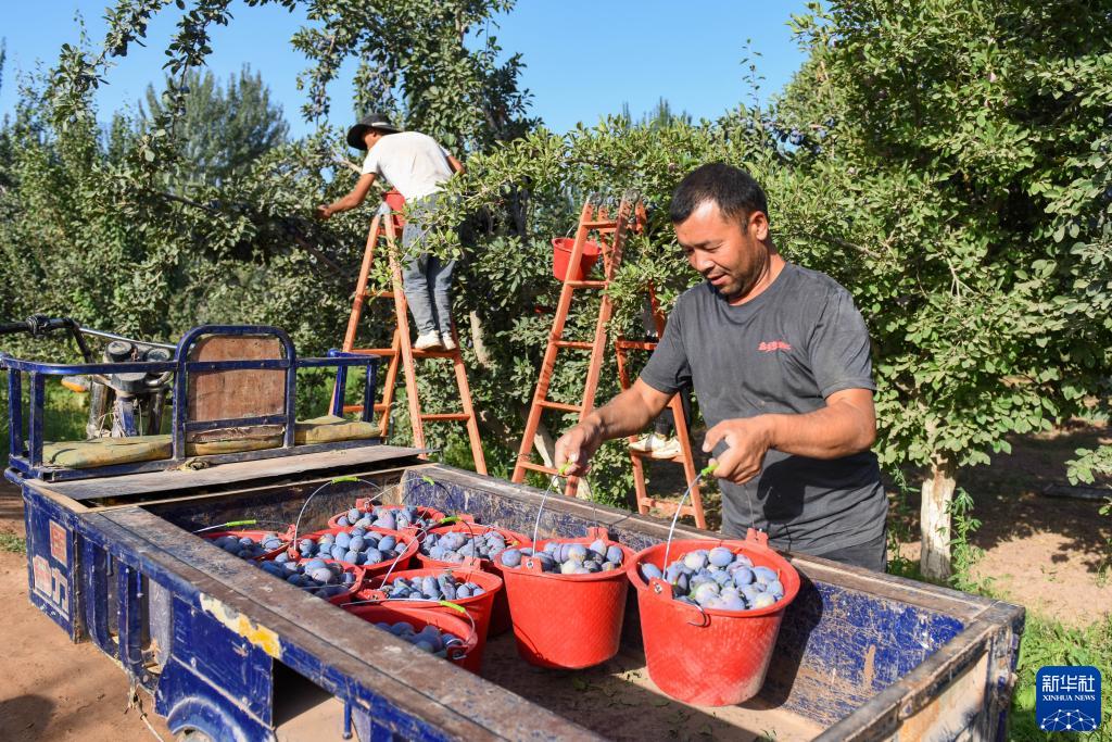 在新疆伽師縣英買(mǎi)里鎮巴格托格拉克村,果農將采摘的新梅裝車(chē)(8月4日攝)。