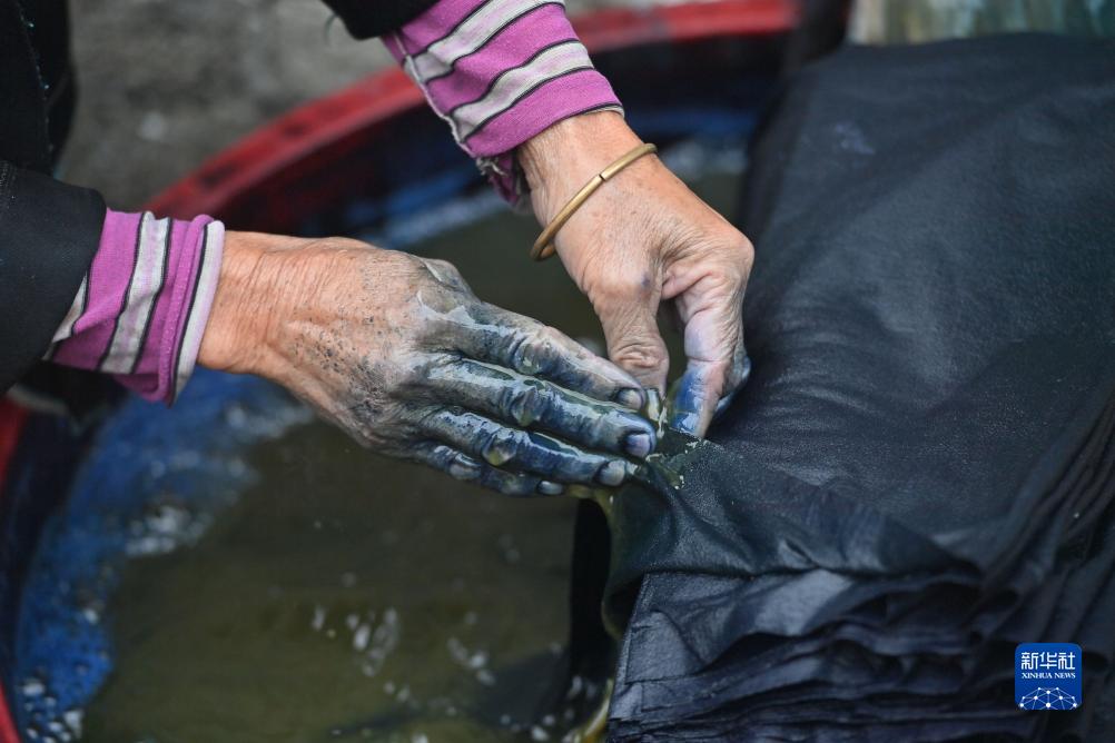 烏英苗寨婦女潘花迷在給布料上漿染色(2023年9月2日攝)。新華社記者 黃孝邦 攝