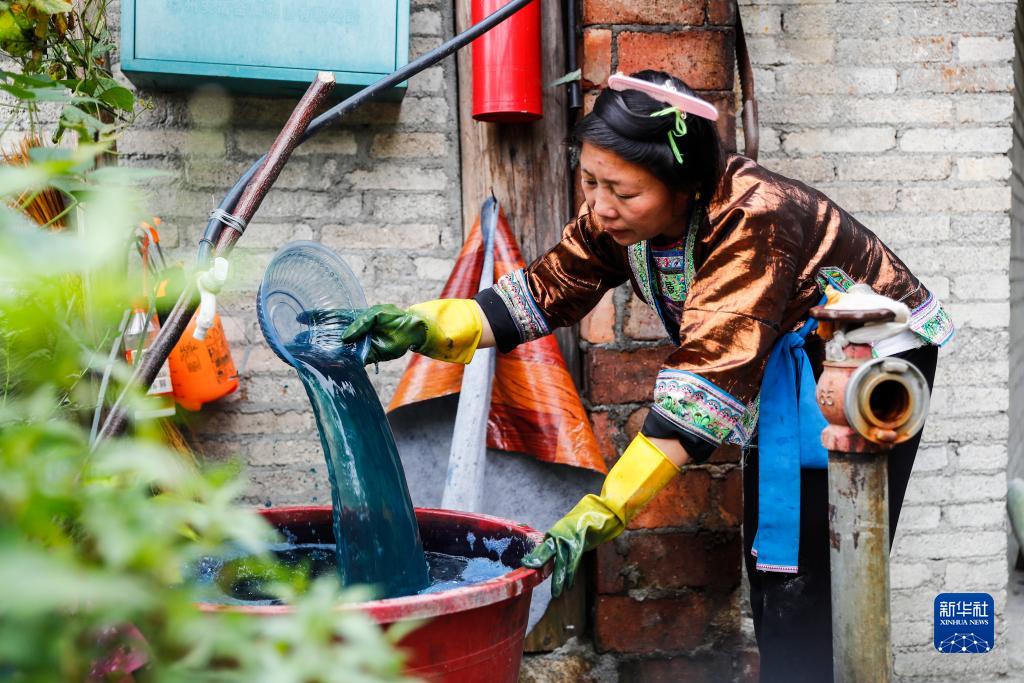 烏英苗寨婦女梁足英用石灰加入藍靛草浸泡水中調制染料(2023年8月31日攝)。新華社記者 胡星宇 攝
