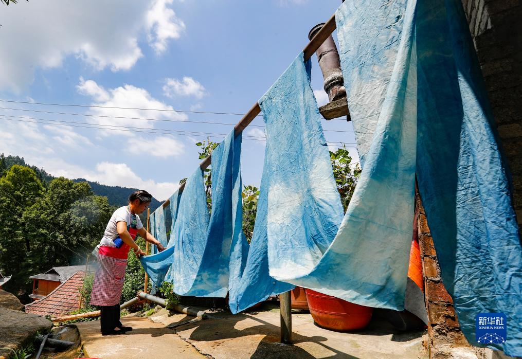 烏英苗寨婦女梁足英在晾曬第一次浸染后的布料(2023年8月31日攝)。新華社記者 胡星宇 攝