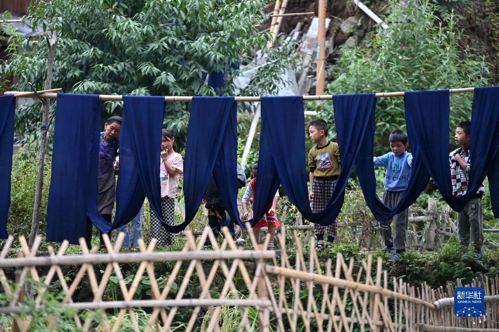 烏英苗寨的孩子們在觀(guān)看老人制作亮布(2022年9月7日攝)。新華社記者 黃孝邦 攝