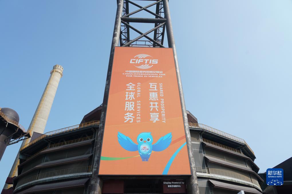 9月3日在首鋼園區拍攝的首鋼一高爐上懸掛著(zhù)2023服貿會(huì )宣傳畫(huà)。