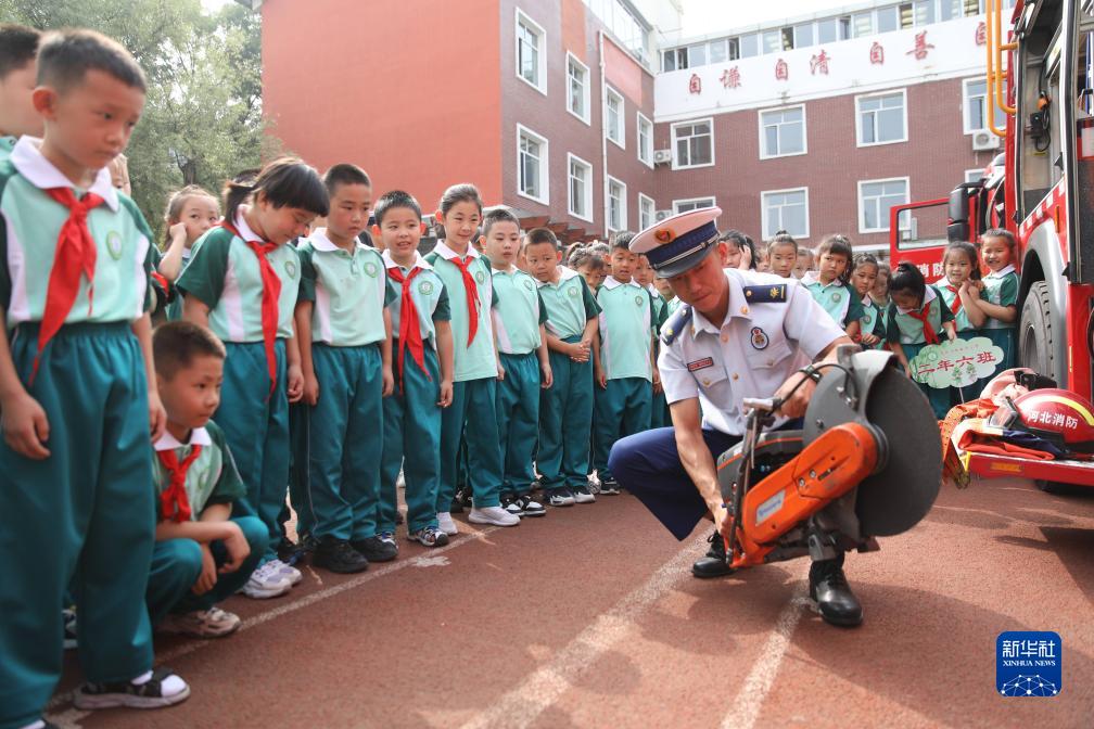 9月4日,在承德市雙橋區竹林寺小學(xué),消防救援隊員為學(xué)生們講解消防器材的使用方法。