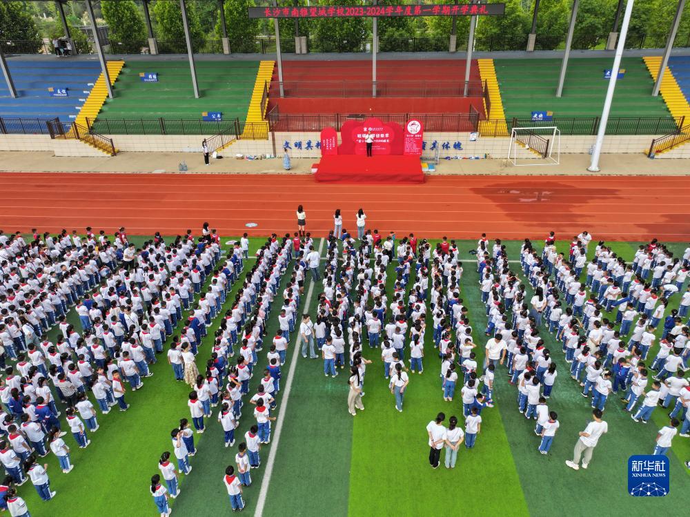 9月4日,在長(cháng)沙市南雅望城學(xué)校,學(xué)生在參加開(kāi)學(xué)典禮(無(wú)人機照片)。