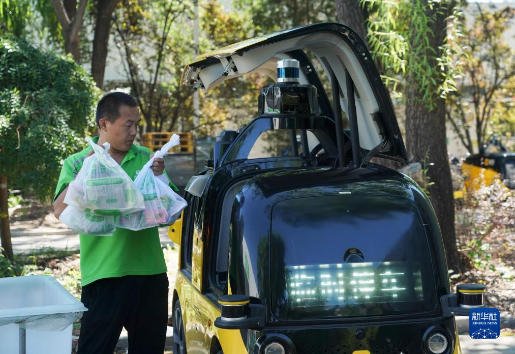 在北京市順義區,一輛輛自動(dòng)配送車(chē)有序行駛在道路上。顧客下單后,工作人員將訂單放入自動(dòng)配送車(chē)中,這些車(chē)輛根據規劃好的路線(xiàn),自動(dòng)駕駛到指定停車(chē)點(diǎn)位,用戶(hù)可通過(guò)手機驗證碼等方式取出訂單,或者通過(guò)騎手在停車(chē)點(diǎn)拿取訂單并配送到顧客手中。