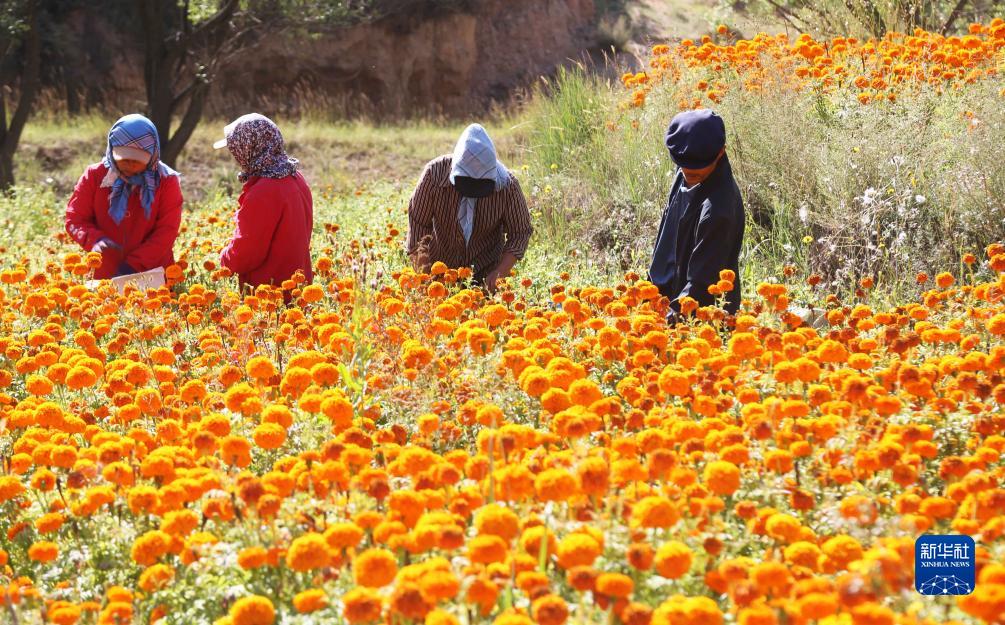 9月4日,農民在甘肅省定西市隴西縣馬河鎮賀家川村采摘萬(wàn)壽菊。