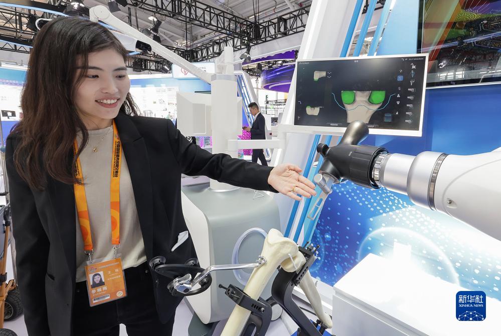 9月4日,在首鋼園健康衛生服務(wù)專(zhuān)題展區,工作人員在北京協(xié)和醫院展臺展示膝關(guān)節手術(shù)機器人。