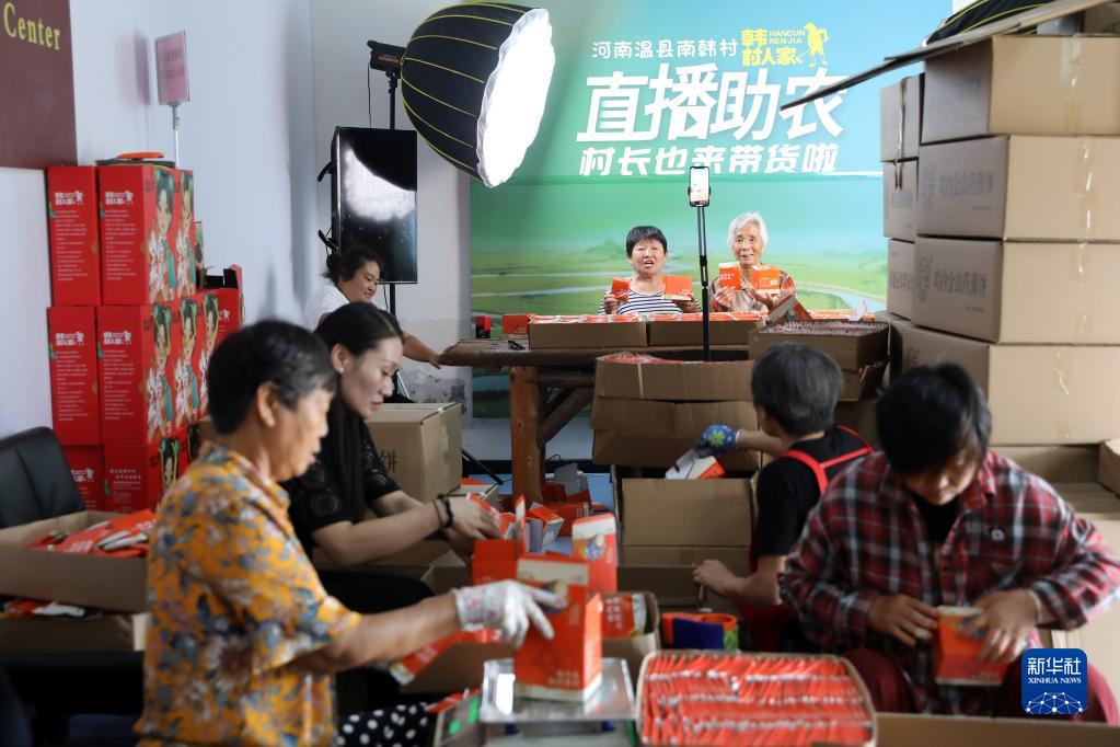 9月4日,在焦作市溫縣黃莊鎮南韓村,村民在直播間包裝當地特產(chǎn)。