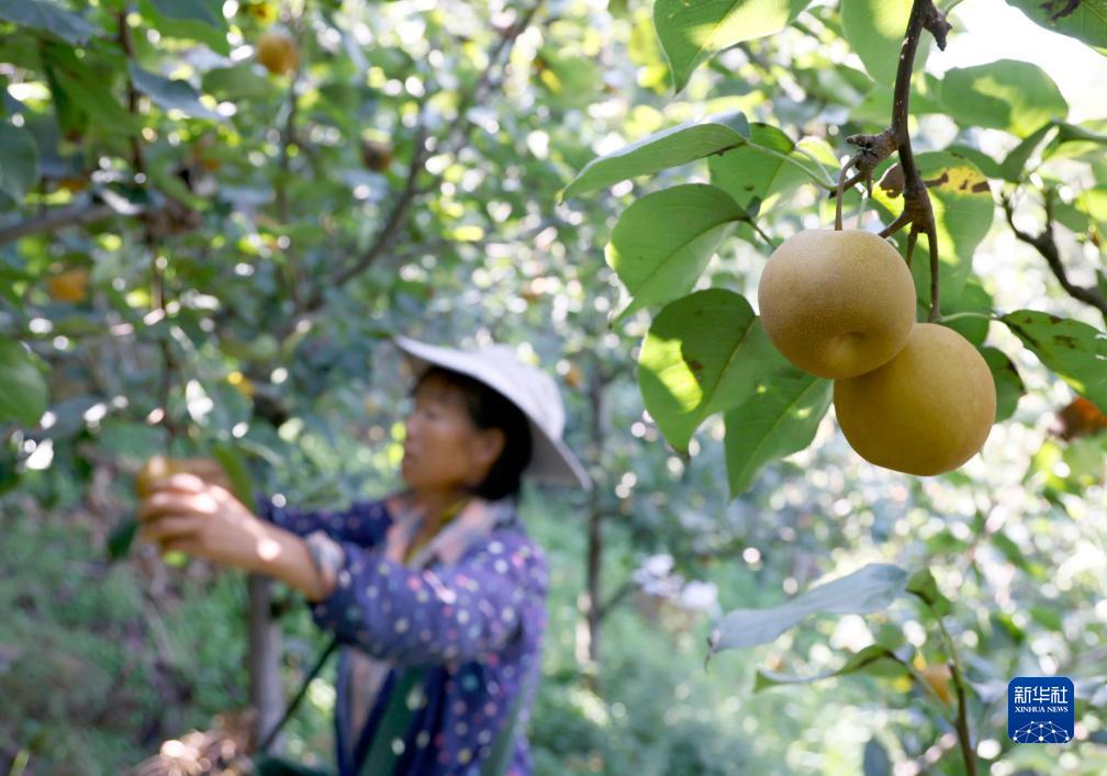 9月5日,果農在貴州省匯川區團澤鎮三聯(lián)村水果種植基地采摘鮮梨。