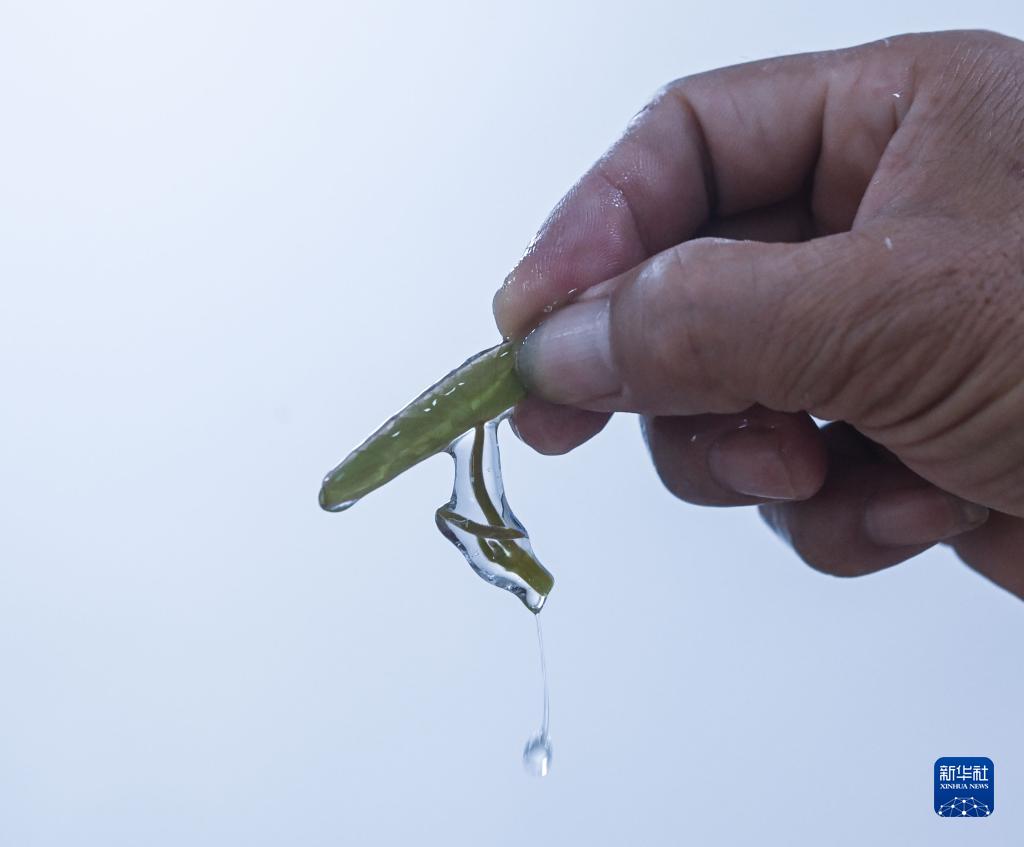 9月5日,在建德市航頭鎮烏龍村西湖莼菜產(chǎn)業(yè)園的車(chē)間內,工人展示富含膠質(zhì)的新鮮莼菜。