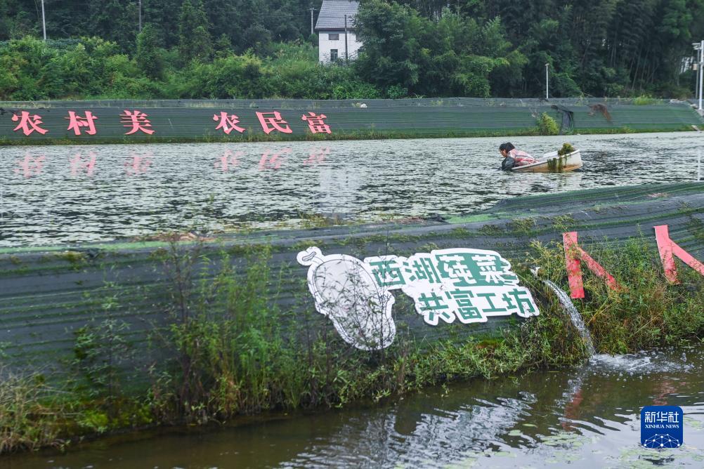9月5日,在建德市航頭鎮烏龍村莼菜基地,村民劃著(zhù)“盆船”在西湖莼菜產(chǎn)業(yè)園種植基地采摘西湖莼菜。