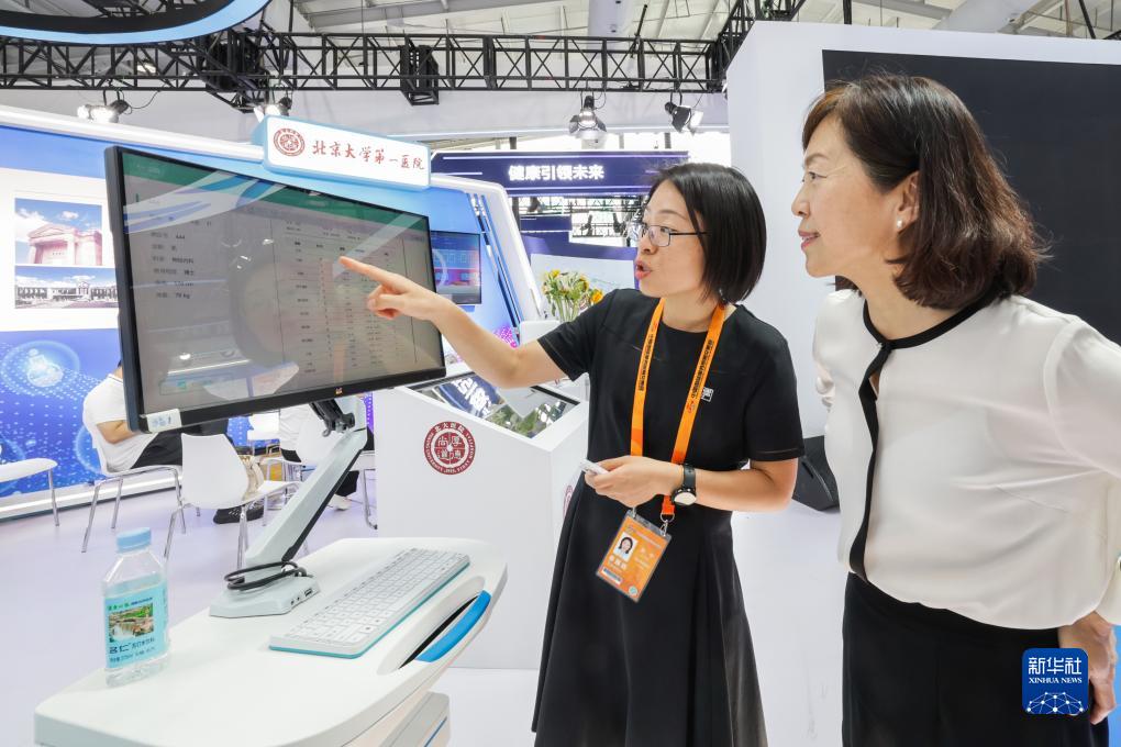 9月4日,在服貿會(huì )首鋼園區北京協(xié)和醫院展臺,工作人員向參觀(guān)者介紹神經(jīng)功能平衡測試系統。