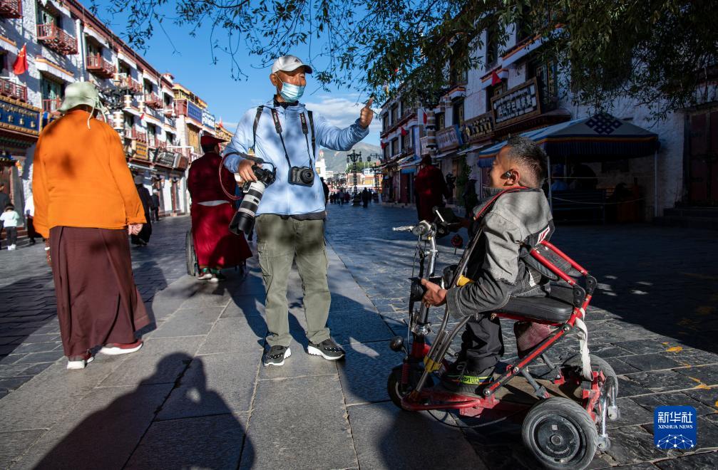 八廓街上,內地攝影愛(ài)好者對拉巴頓珠豎起大拇指(9月3日攝)。