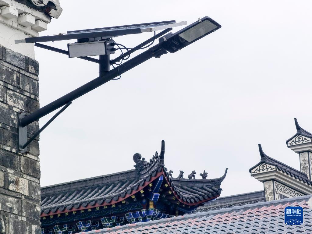 江西南昌進(jìn)賢縣泉嶺鄉前溪村街頭的太陽(yáng)能路燈與古色古香的民居檐角相映成趣(9月5日攝)。2021年10月開(kāi)始,前溪村大力推進(jìn)農村路域環(huán)境整治、人居環(huán)境整治和農業(yè)特色產(chǎn)業(yè)升級。