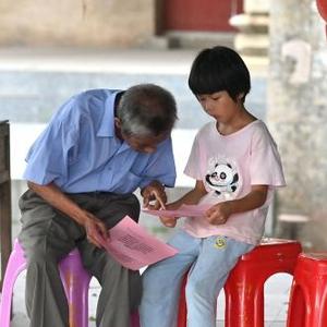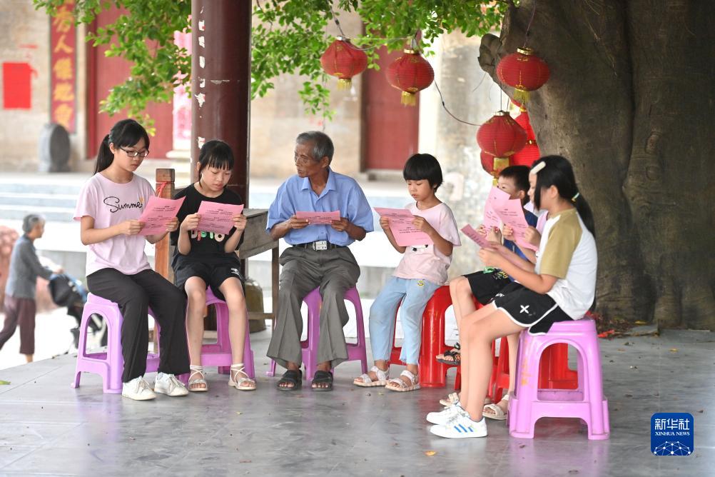 在梧州市長(cháng)洲區長(cháng)洲鎮泗洲村,陳明仲(左三)在教小學(xué)生唱下俚歌(8月24日攝)。