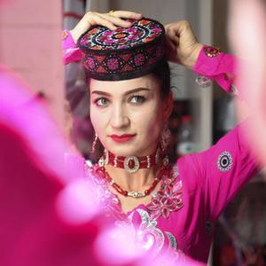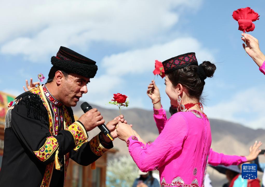 在新疆塔什庫爾干塔吉克自治縣帕米爾旅游區游客服務(wù)中心,縣文工團演員唱歌跳舞歡迎游客(9月4日攝)。