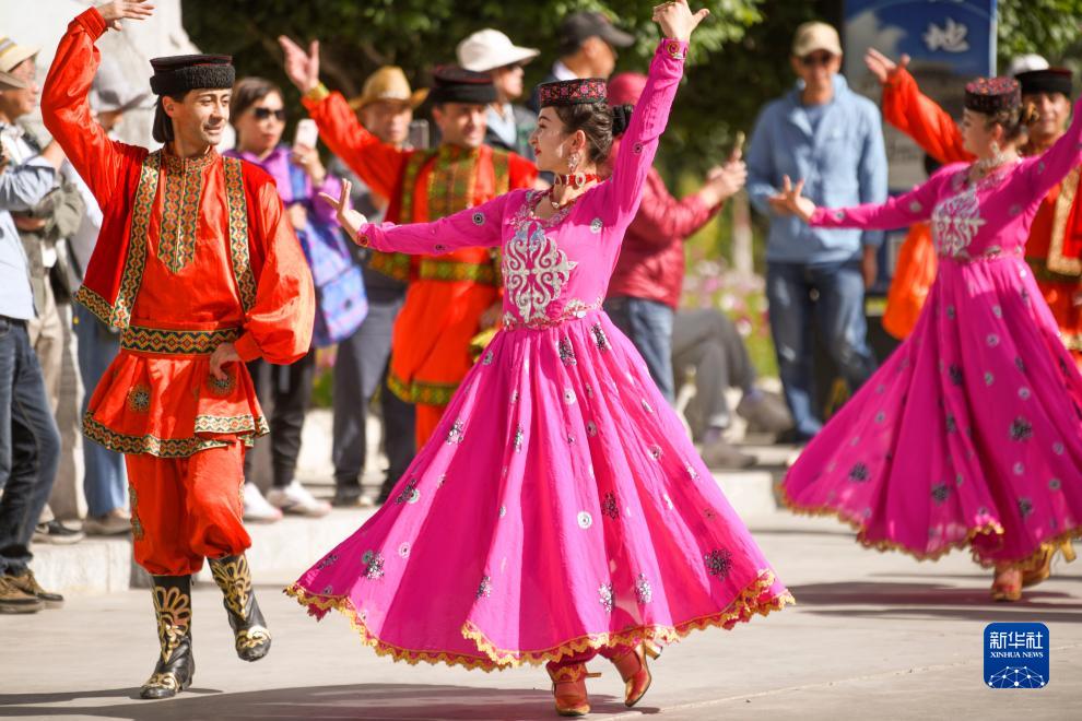 在新疆塔什庫爾干塔吉克自治縣帕米爾旅游區游客服務(wù)中心,縣文工團演員跳舞歡迎游客(9月4日攝)。