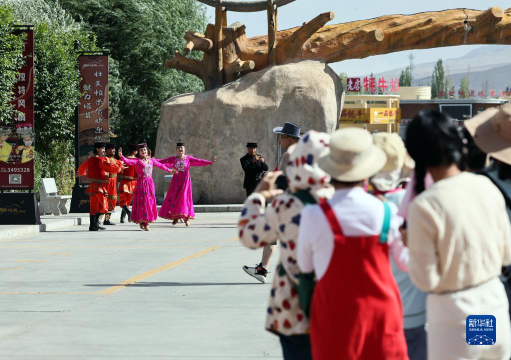 在新疆塔什庫爾干塔吉克自治縣帕米爾旅游區游客服務(wù)中心,縣文工團演員跳舞歡迎游客(9月4日攝)。