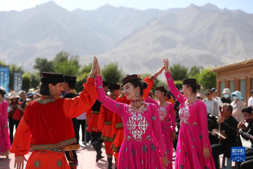 在新疆塔什庫爾干塔吉克自治縣帕米爾旅游區游客服務(wù)中心,縣文工團演員跳舞歡迎游客(9月4日攝)。