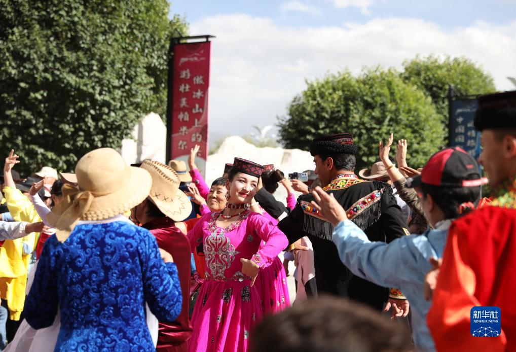 在新疆塔什庫爾干塔吉克自治縣帕米爾旅游區游客服務(wù)中心,縣文工團演員與游客共舞(9月4日攝)。