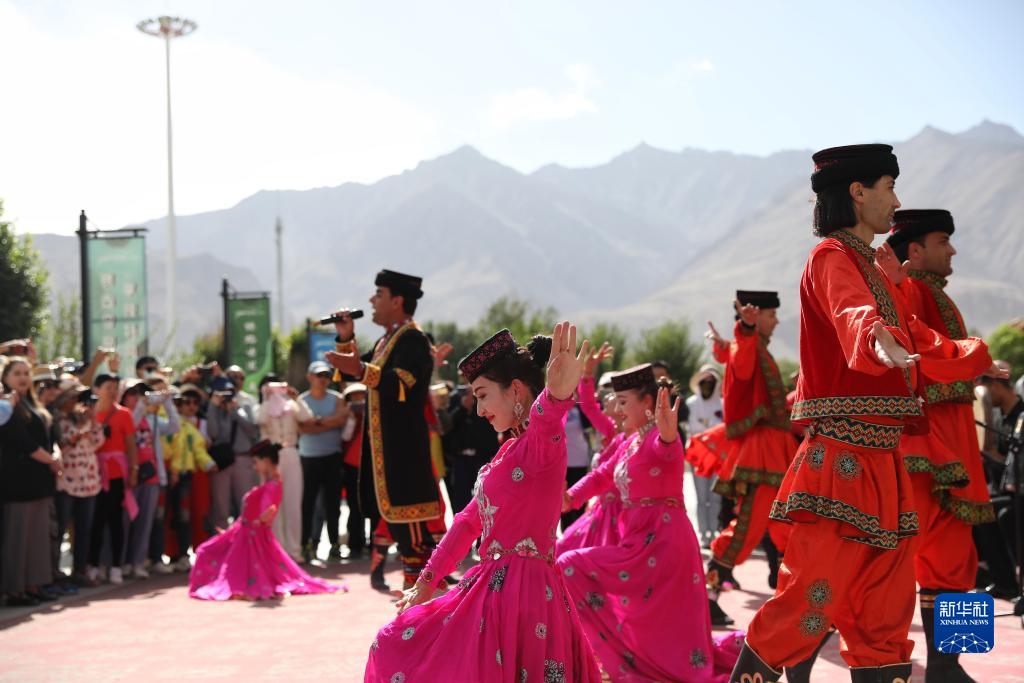 在新疆塔什庫爾干塔吉克自治縣帕米爾旅游區游客服務(wù)中心,縣文工團演員唱歌跳舞歡迎游客(9月4日攝)。