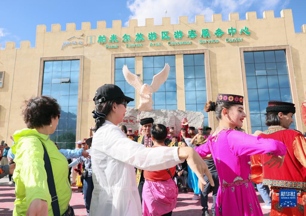 在新疆塔什庫爾干塔吉克自治縣帕米爾旅游區游客服務(wù)中心,縣文工團演員與游客共舞(9月4日攝)。
