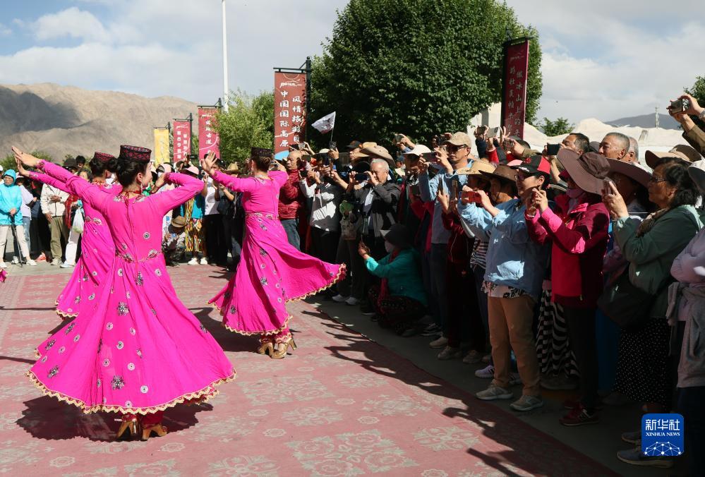 在新疆塔什庫爾干塔吉克自治縣帕米爾旅游區游客服務(wù)中心,縣文工團演員跳舞歡迎游客(9月4日攝)。