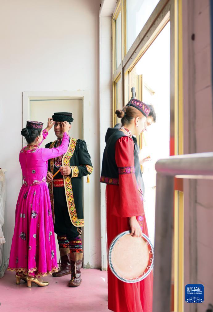 在新疆塔什庫爾干塔吉克自治縣帕米爾旅游區游客服務(wù)中心,縣文工團演員在演出前做準備(9月4日攝)。