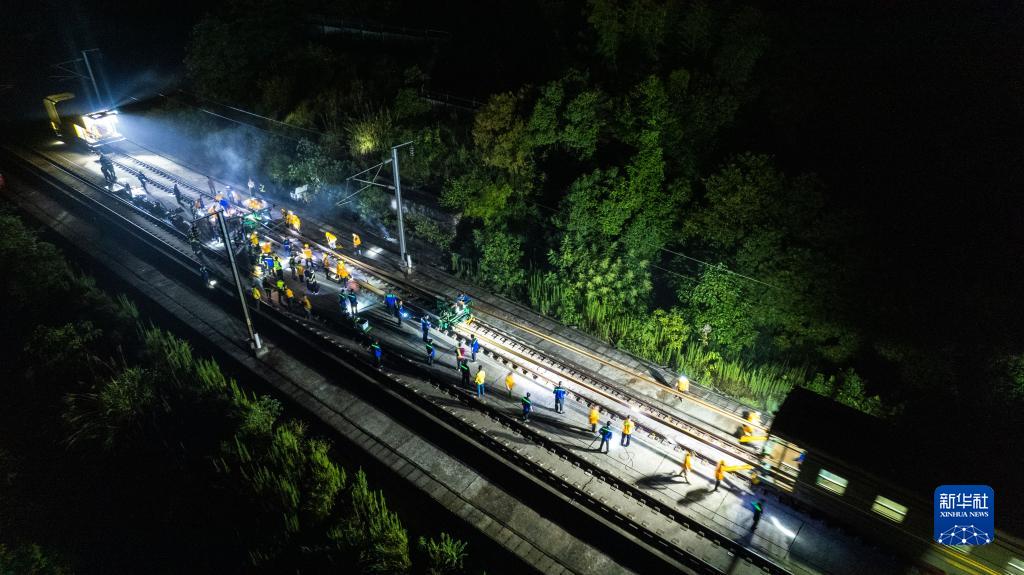 9月6日凌晨,鐵路工人在京廣高鐵株洲西至衡山西區間進(jìn)行換軌施工(無(wú)人機照片)。