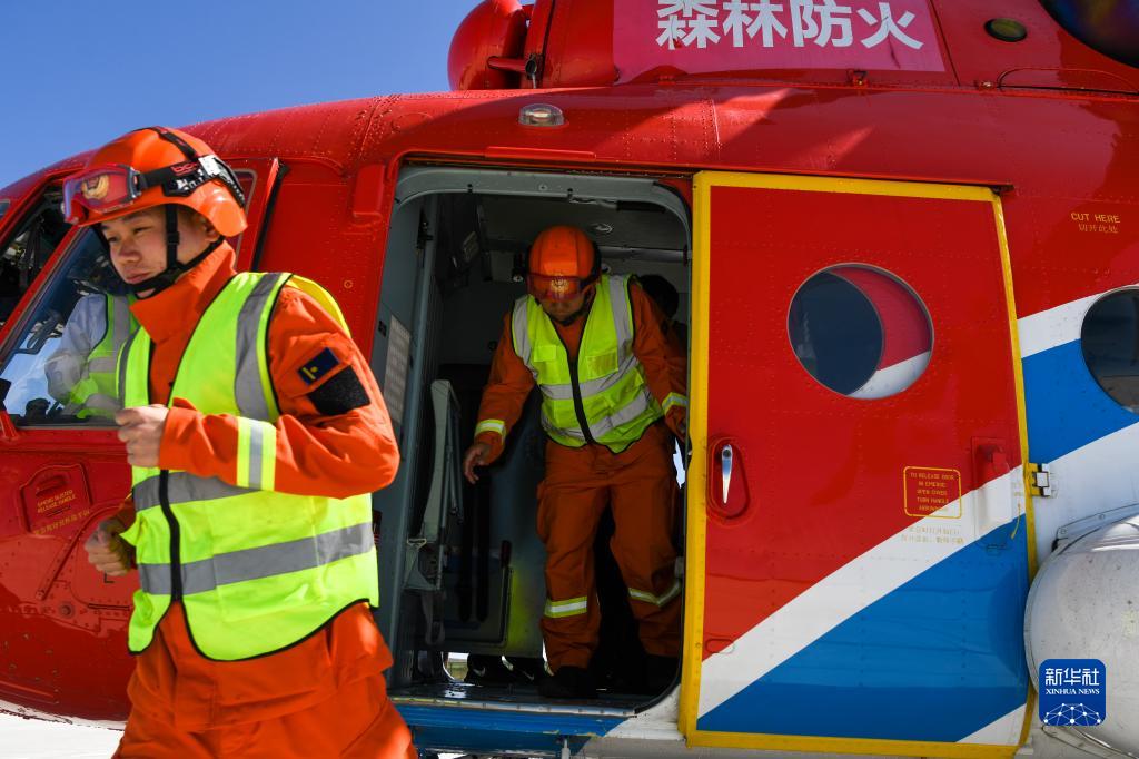 新疆伊犁哈薩克自治州森林消防支隊指戰員在昭蘇天馬機場(chǎng)進(jìn)行訓練(9月5日)。