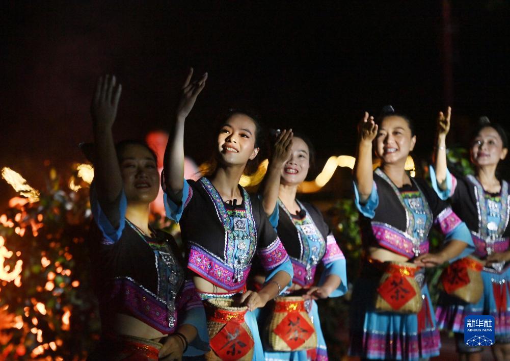 9月5日,在梧州市蒼梧縣六堡鎮山坪村同心廣場(chǎng),村民在篝火晚會(huì )上跳采茶舞。