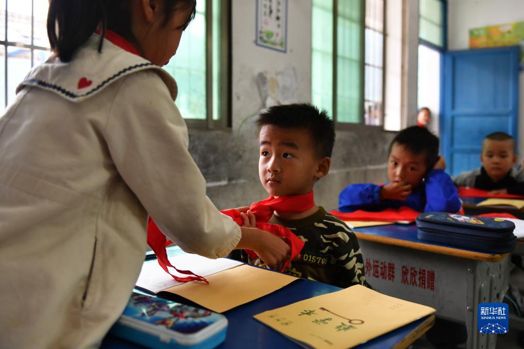 9月4日,報木小學(xué)三年級學(xué)生在教一年級學(xué)生系紅領(lǐng)巾。