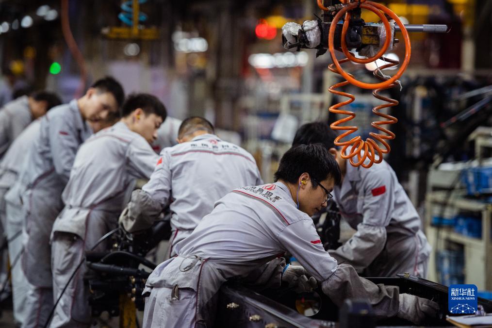9月6日,在東風(fēng)商用車(chē)有限公司車(chē)輛工廠(chǎng),工人在進(jìn)行整車(chē)管線(xiàn)束鋪設作業(yè)。