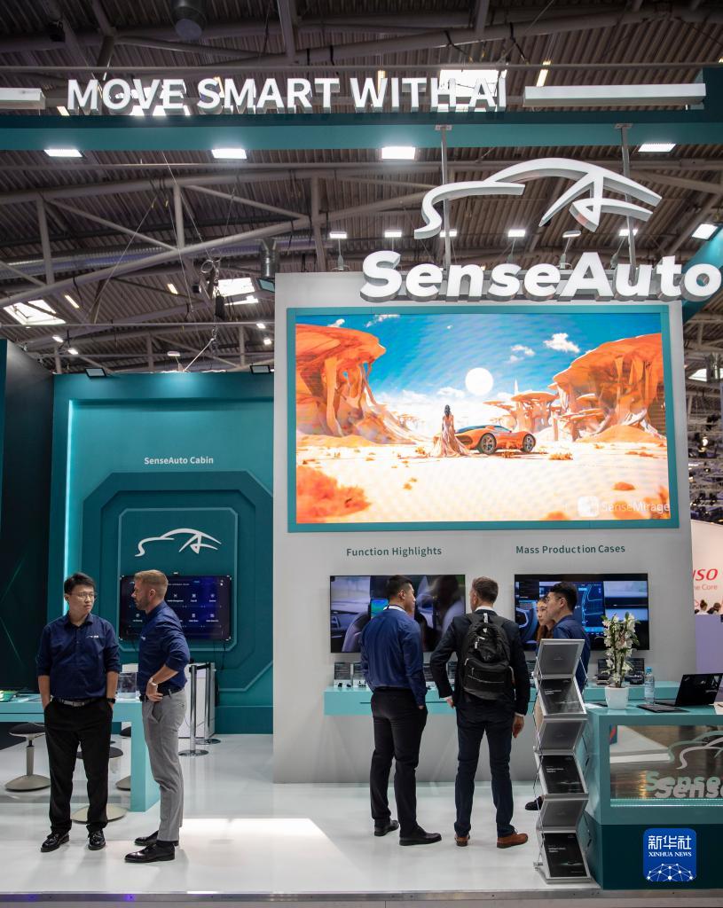 這是9月4日在德國慕尼黑國際車(chē)展媒體預展上拍攝的商湯科技展臺。