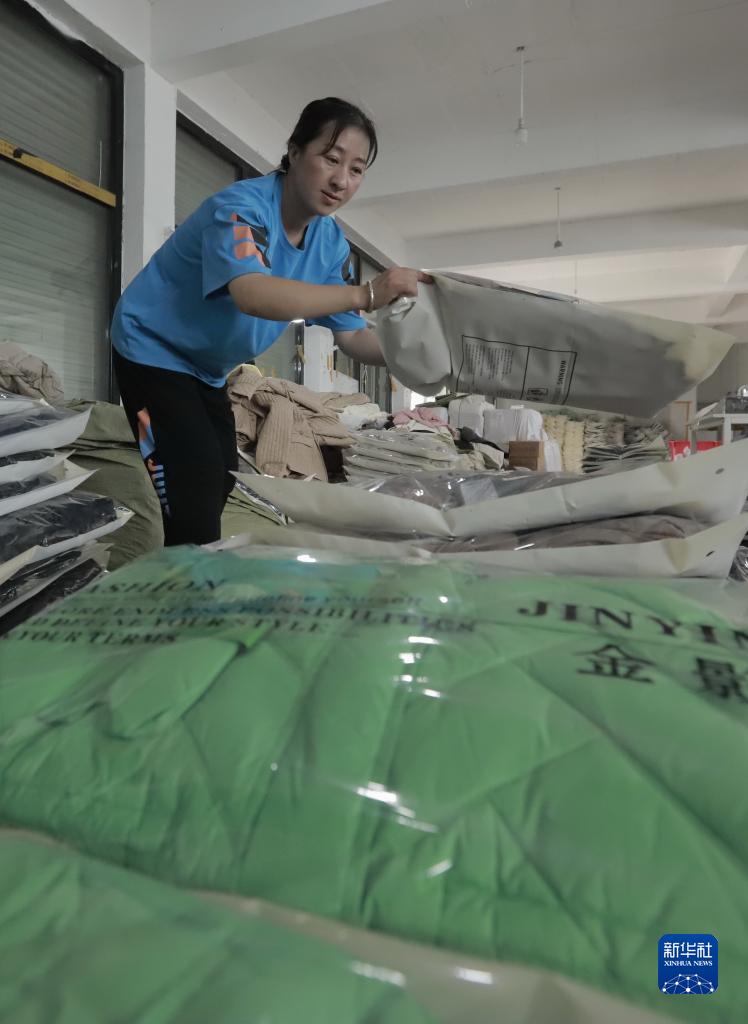 9月6日,工人在遵化市石門(mén)鎮一家服裝加工企業(yè)的成品車(chē)間整理服裝。
