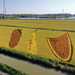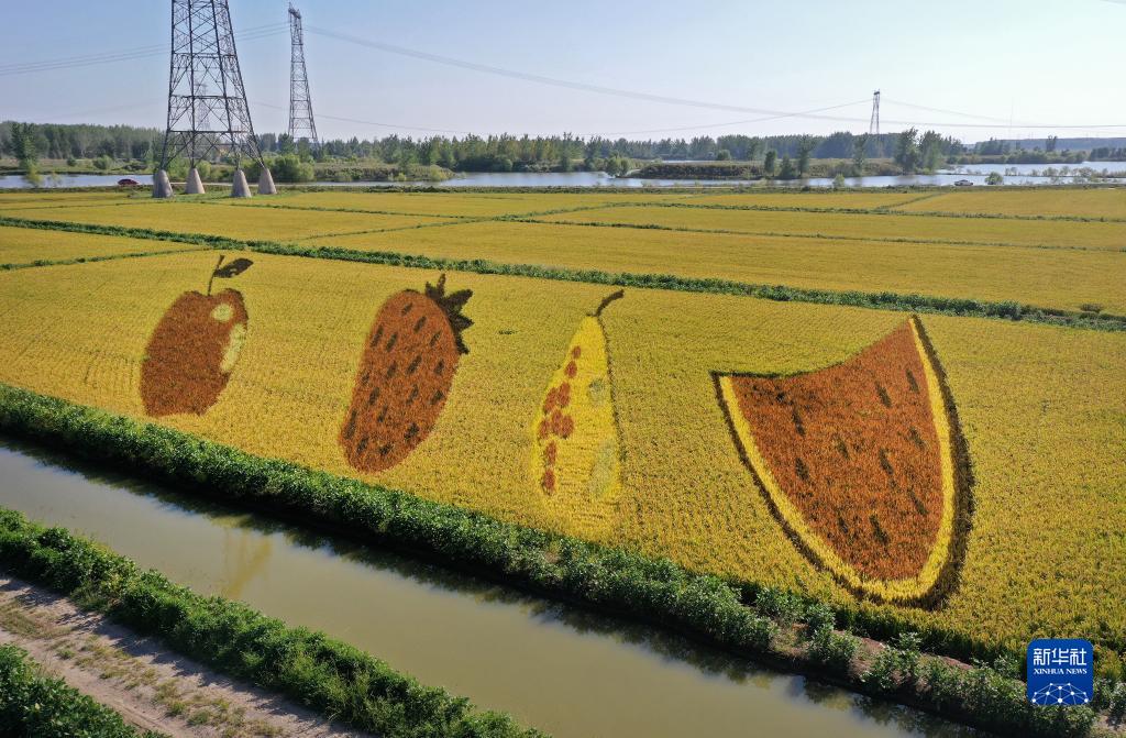 初秋時(shí)節,遼寧省鞍山市臺安縣遼河文化旅游景區的稻田畫(huà)吸引不少游客前來(lái)參觀(guān)游覽。由多種顏色組成的巨型稻田畫(huà)勾勒出豐收壯美景象。