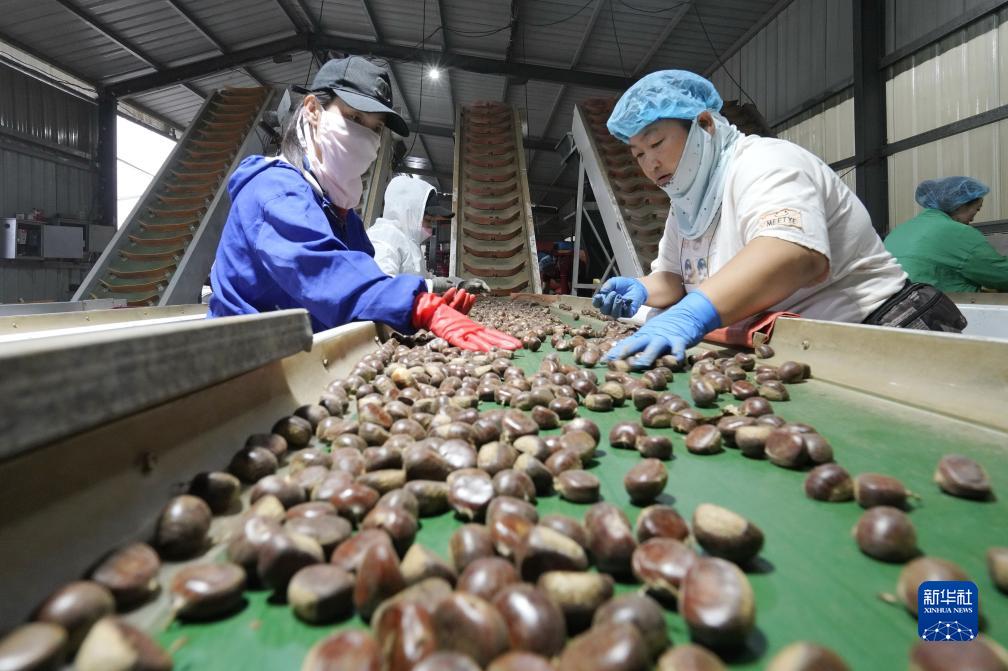 9月7日,河北省遵化市堡子店鎮一家板栗種植合作社的社員在分揀收獲的板栗。