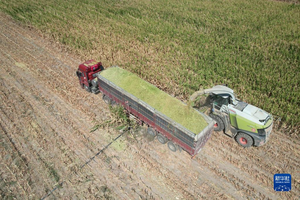 9月6日,在金昌市永昌縣六壩鎮八壩村,工作人員使用大型機械收獲青貯玉米(無(wú)人機照片)。