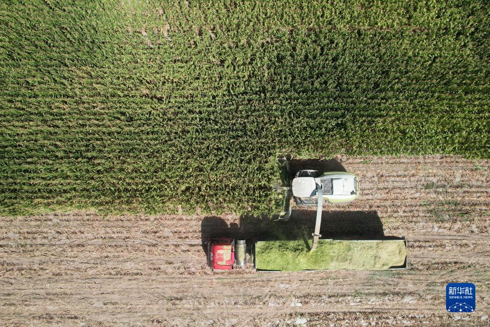 9月6日,在金昌市永昌縣六壩鎮八壩村,工作人員使用大型機械收獲青貯玉米(無(wú)人機照片)。