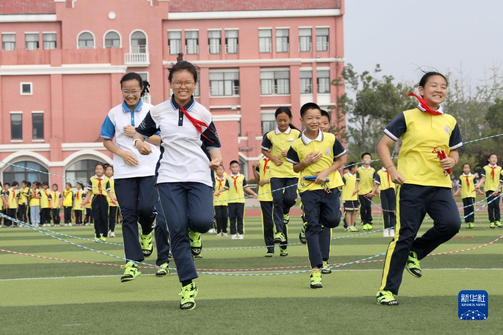 9月7日,山東省青島西海岸新區弘德學(xué)校學(xué)生在大課間練習跳繩。
