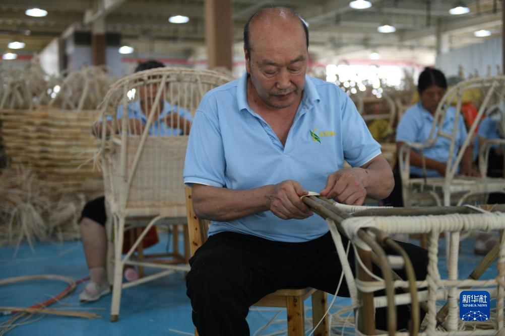 9月7日,在位于漢中市的陜西良順匠心實(shí)業(yè)有限公司,工作人員在編織藤椅。