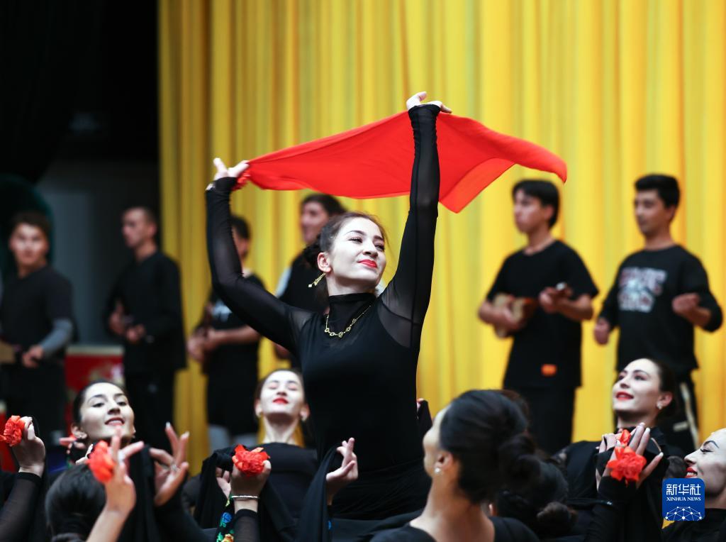 古麗巴努爾·庫爾恰克和同事們在排練舞蹈節目《花兒為什么這樣紅》(9月4日攝)。