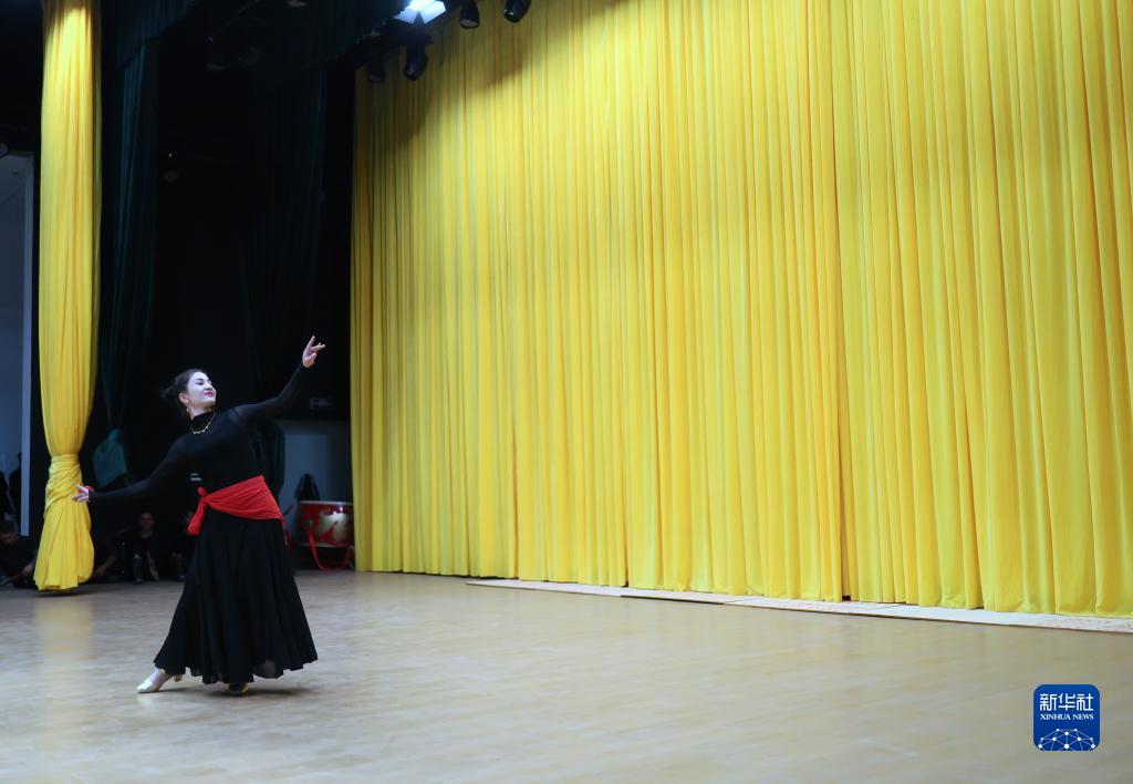 古麗巴努爾·庫爾恰克在文化服務(wù)中心劇場(chǎng)排練舞蹈節目《花兒為什么這樣紅》(9月4日攝)。