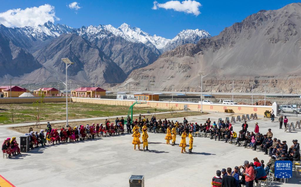 新疆塔縣文工團演員古麗巴努爾·庫爾恰克和同事們在達布達爾鄉的一處山村為村民表演舞蹈節目(2020年6月6日攝,無(wú)人機照片)。