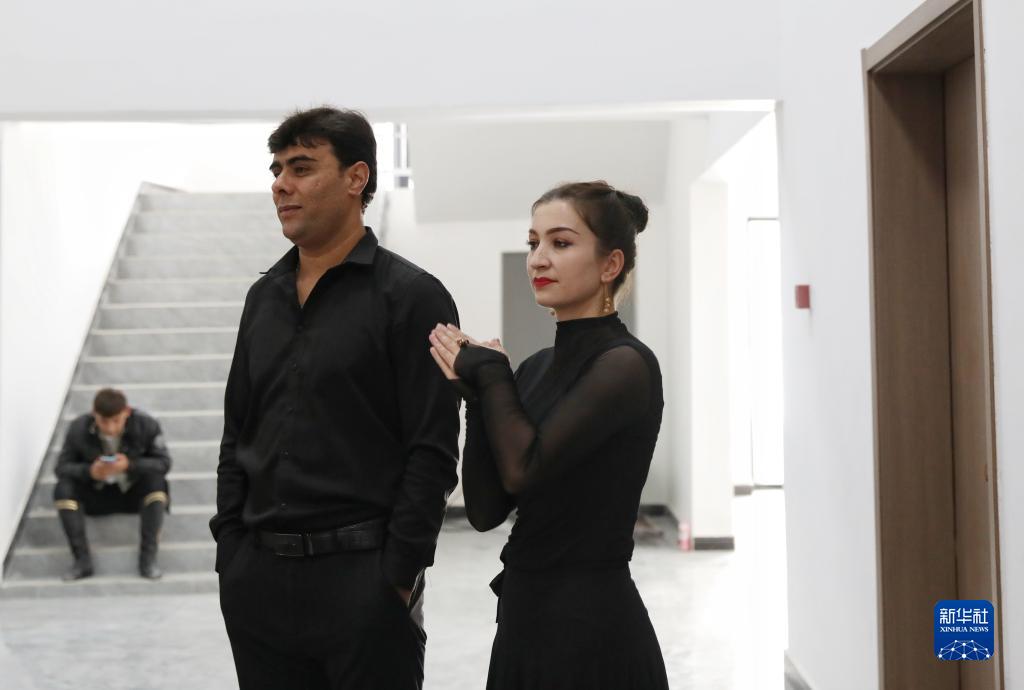 排練間歇,拜合提亞爾·居馬汗和妻子在一旁觀(guān)看同事排練(9月4日攝)。